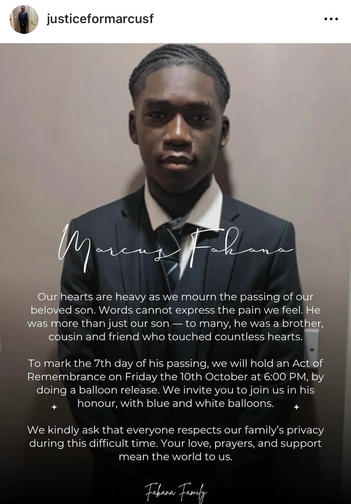 Family of Marcus Fakana shares heartbreaking message following his death