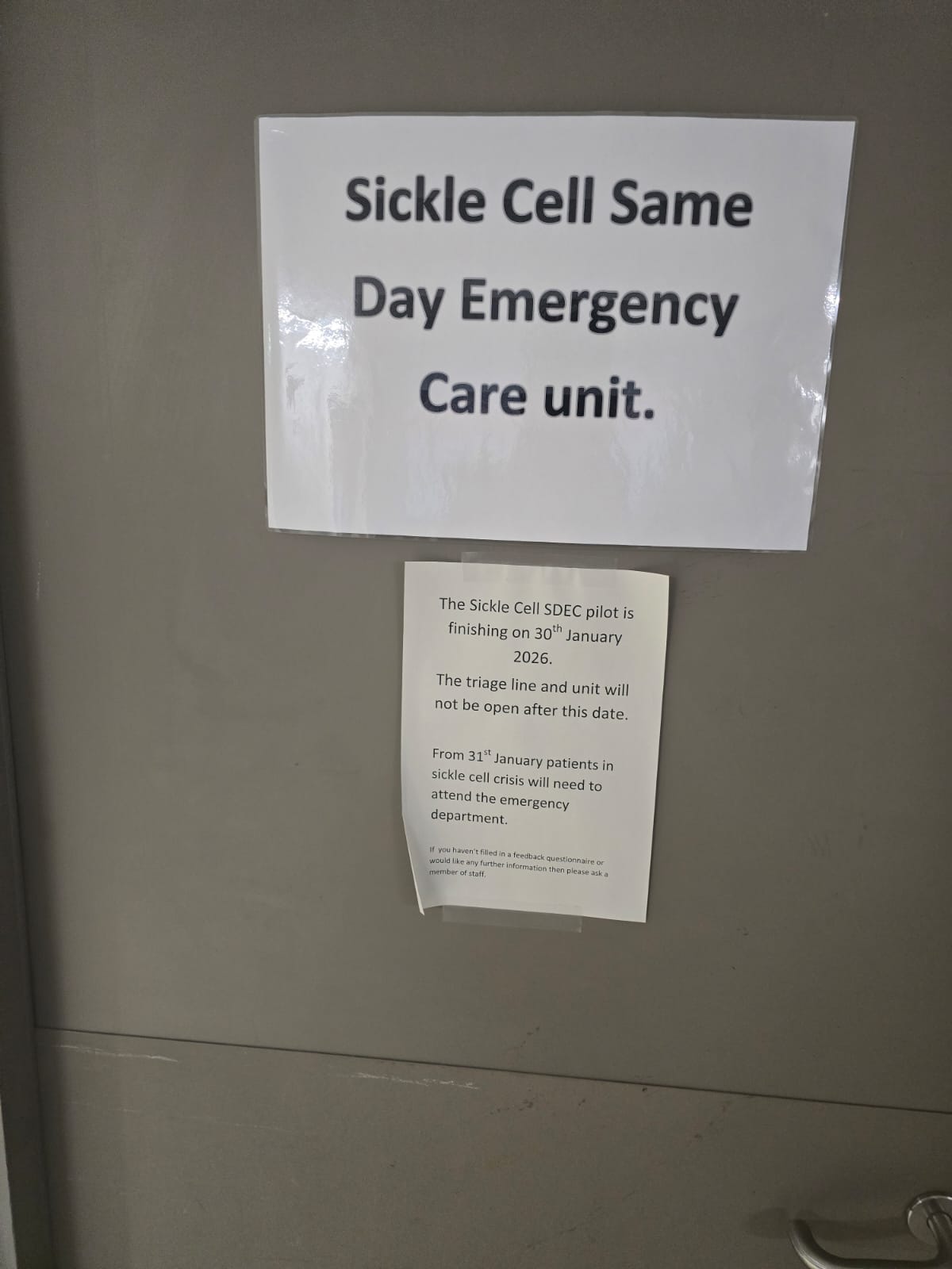 Sickle cell patients at the Royal London Hospital have been greeted by a sign which has been taped onto a door, notifying them that they will need to use A&E as of January 31.
